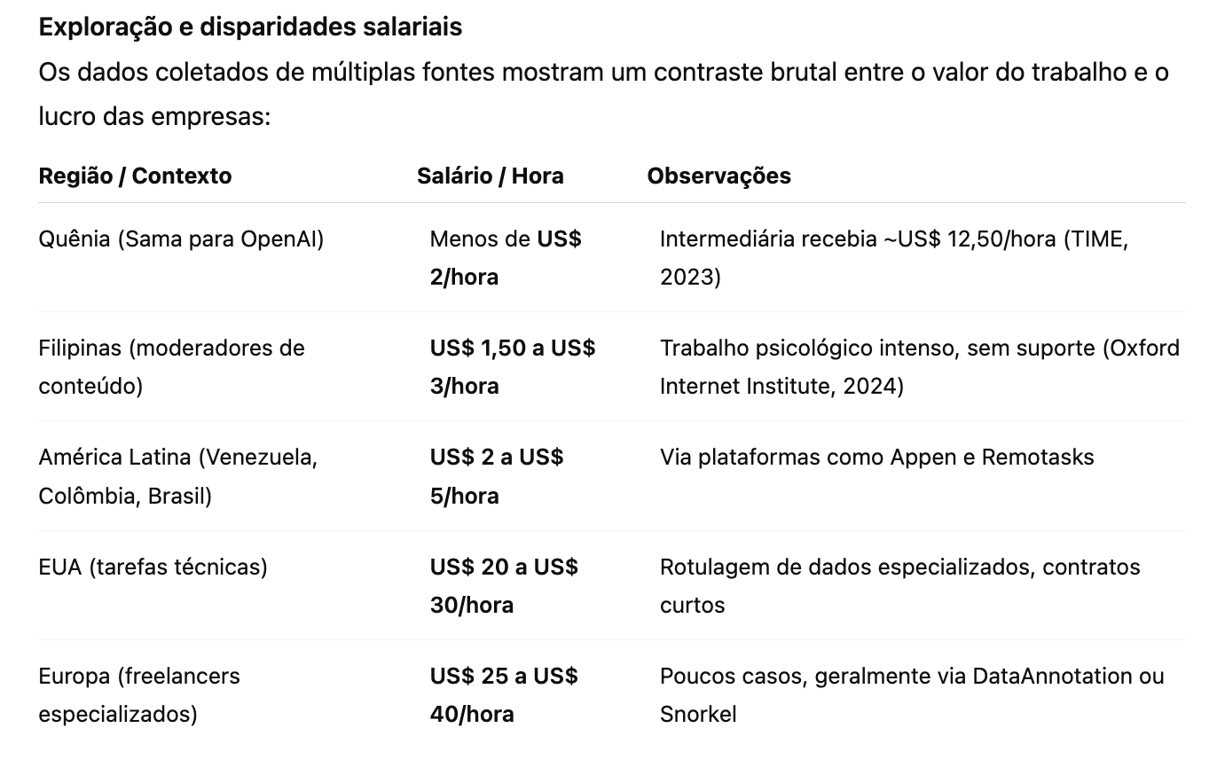 Segundo um relatório da TIME (2023), funcionários quenianos contratados pela empresa Sama, que prestava serviços à OpenAI, recebiam menos de US$ 2 por hora, apesar de a OpenAI pagar cerca de US$ 12,50 por hora à intermediária. Esse abismo revela a natureza predatória das cadeias de subcontratação.