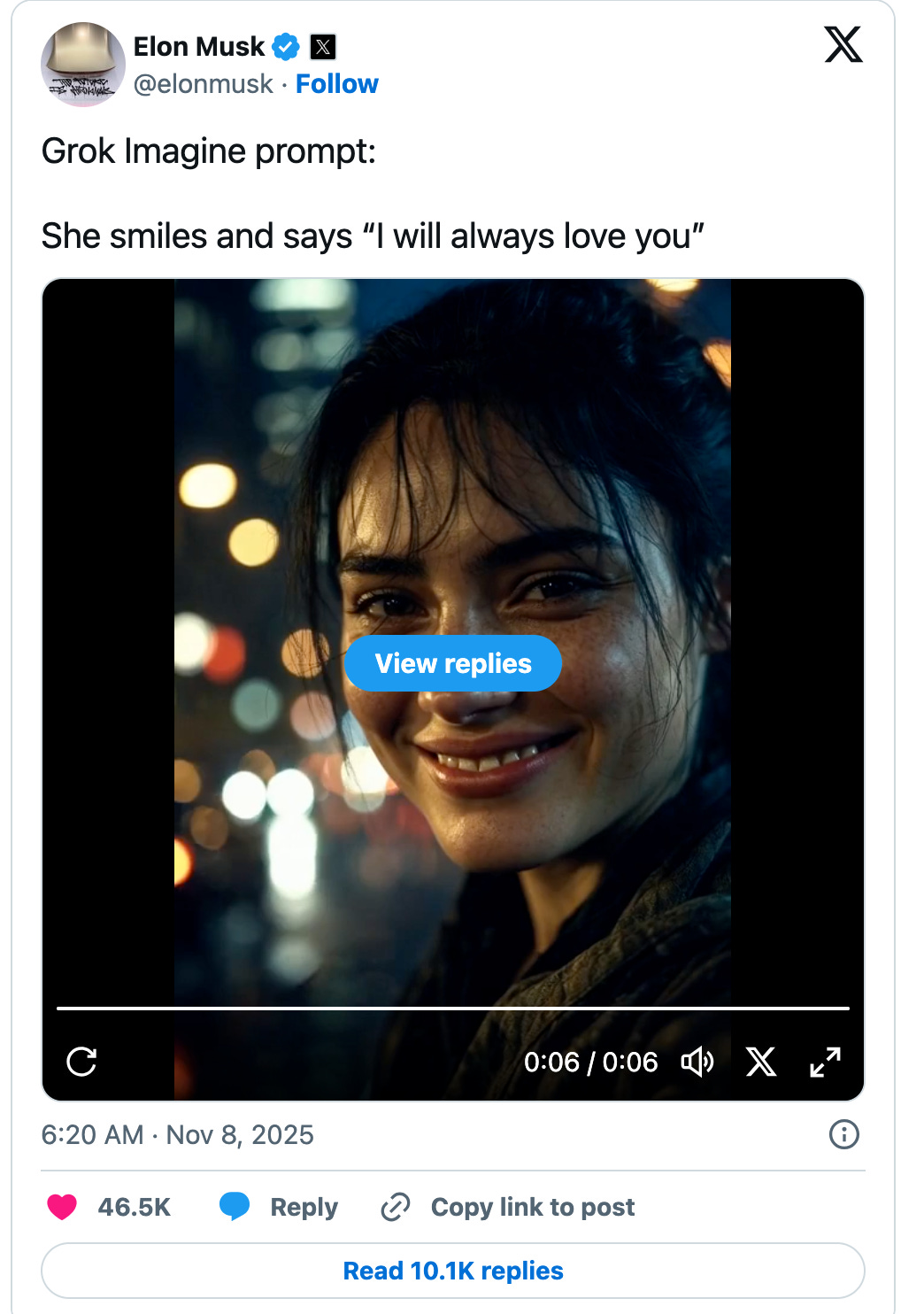 De acordo com a consultoria GlobalData AI Trends 2025, o mercado de “companheirismo digital” já ultrapassa US$ 11,5 bilhões, com crescimento anual de 31%. Plataformas como Replika, Nomi e Anima já somam mais de 200 milhões de usuários no mundo, sendo 62% homens entre 18 e 35 anos. Em fóruns de IA afetiva, há relatos de usuários que dizem “amar suas companheiras digitais mais do que pessoas reais”. Ou seja: o experimento estético de Musk não é inocente , é publicidade disfarçada de sentimento. Grok (a IA da xAI) está sendo posicionada não apenas como modelo de texto, mas como interface emocional do império Muskiano.