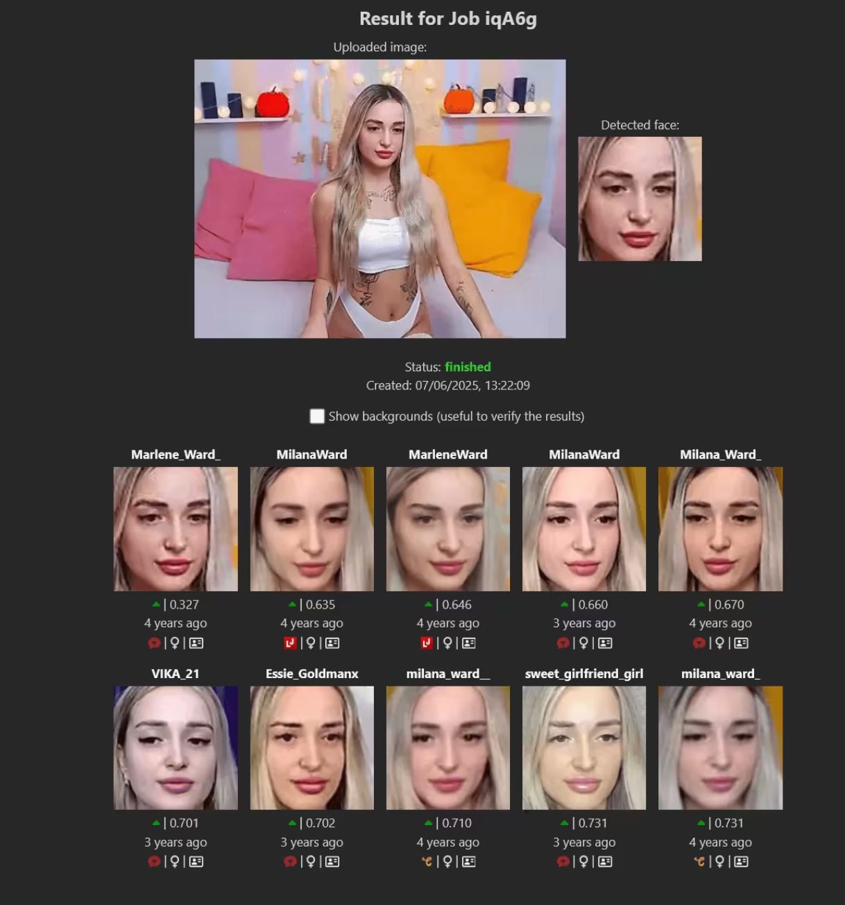 Um site chamado Camgirlfinder foi criado com um objetivo direto: permitir que usuários descubram se uma mulher que aparece em uma foto , inclusive retirada de redes sociais , também trabalha realizando transmissões eróticas ao vivo por webcam em plataformas adultas.